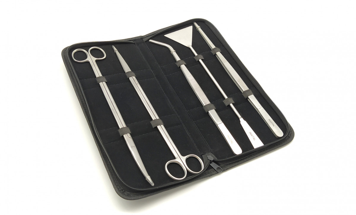 Set pinzet, nůžek a uhlazovaček dna pro údržbu rostlinného akvária.